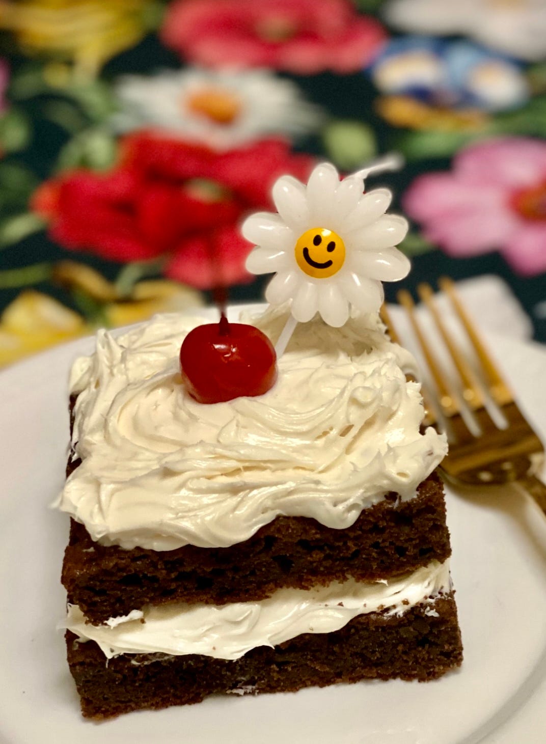 I used 4 squares of unsweetened dark chocolate and 1 3/4 cups of sugar. I did not separate the eggs. It was tender and chocolatey and moist. It would need nothing more than a dusting of confectioners sugar, but I dolled it up with vanilla buttercream, a cherry and a candle because it’s a celebration cake.