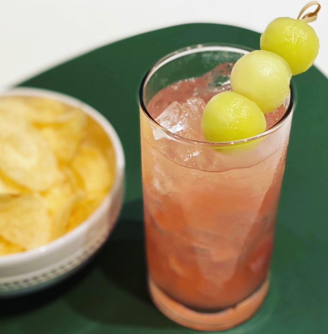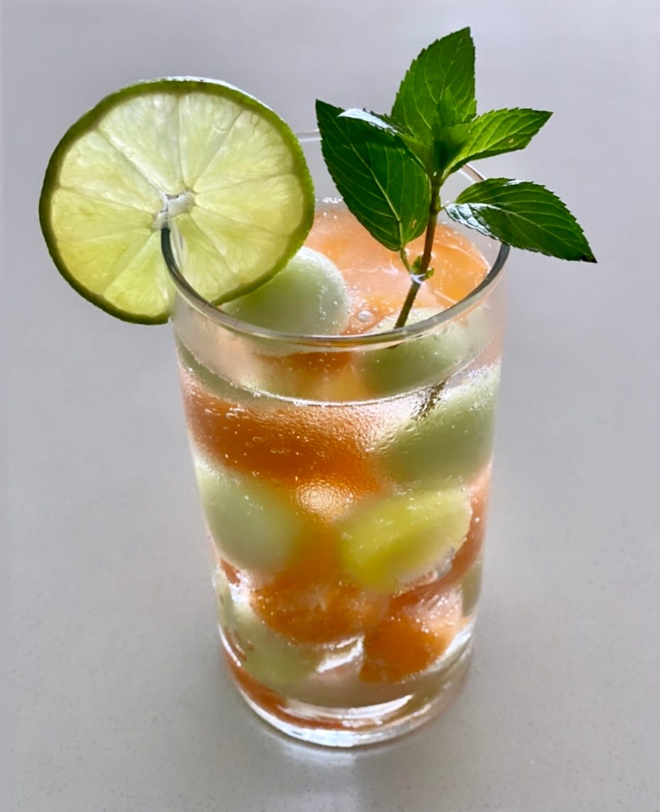 So I went a little overboard with the amount of fresh melon balls that I froze and certainly with the amount I put in this glass of club soda, but let me tell you: using frozen melon balls as ice cubes is really good.