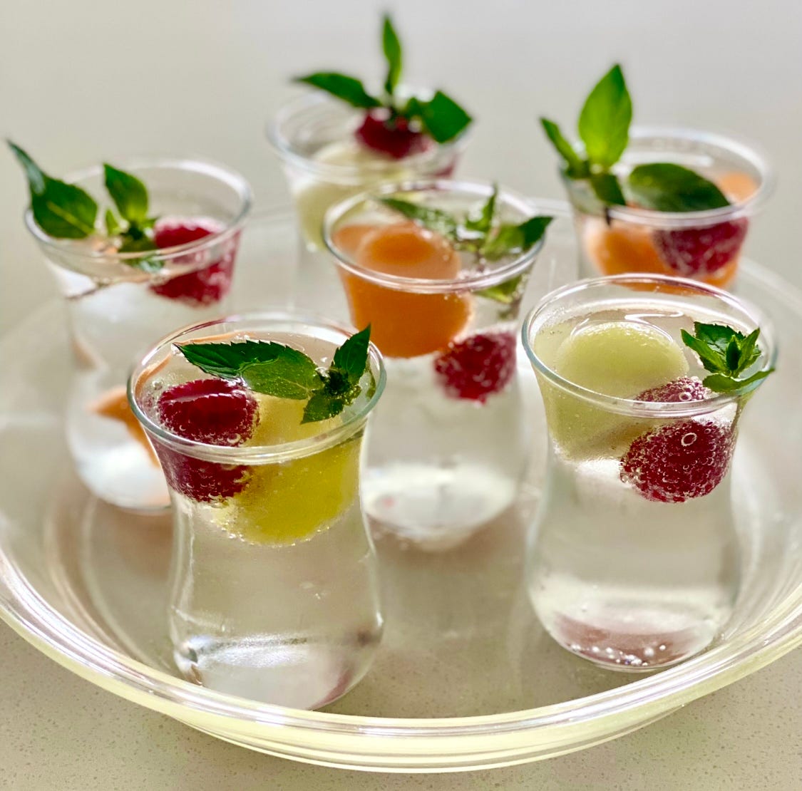 I dug out my little tea glasses and added raspberry to the melon ball ice cubes and club soda and they’re fun to serve from. I’ve always appreciated being offered something nice and cool to drink the minute you arrive somewhere, before you even have a proper cocktail or mocktail. Also, they are a perfect size for children to have a glass of water or some juice from.