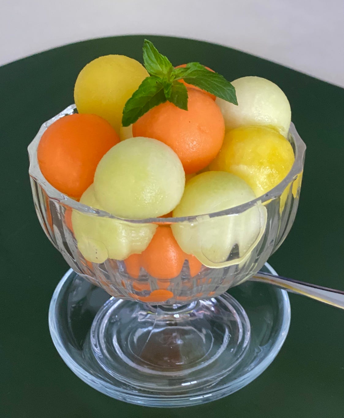 At the farmer’s market this week I picked up three beautiful, heavy and fragrant melons: cantaloupe, honeydew and yellow watermelon and made melon ball cups with a sprig of mint. The only things missing were the Libbey glasses. When the melon is this good, just scoop and serve.🧡