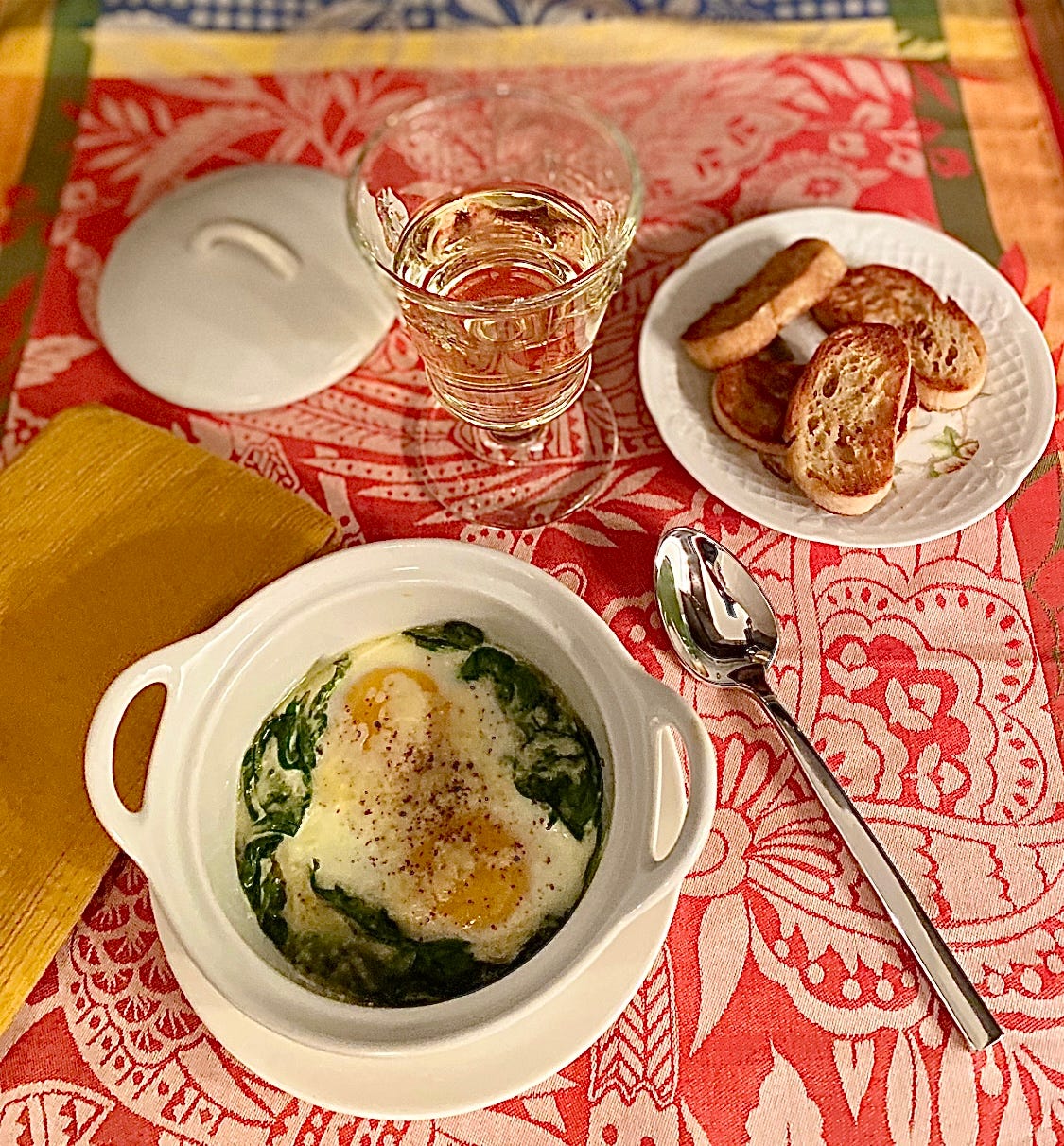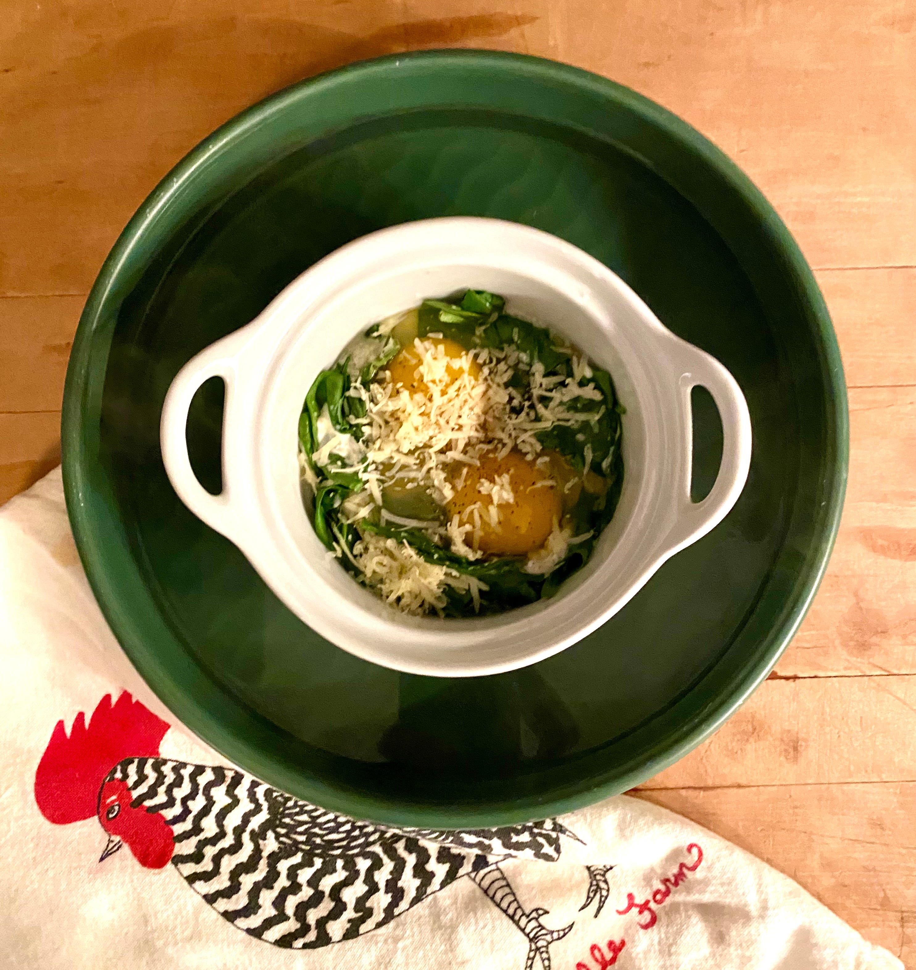Preheat oven to 375 degrees. Butter an 8 oz. cocotte or ramekin. Place wilted (microwaved) spinach at the base of the ramekin and add 2 tbsp. cream. Place half of the grated cheese over spinach. Place cocotte/ramekin in a pan of simmering water (water should be about halfway up) and let it heat the ingredients a bit. Then, make a well in the center and crack two eggs in. Add a grind of fresh pepper (no salt, Julia says that makes eggs tough - salt after) add remaining cheese on top. Place in oven and bake for 10 minutes (more if you want firmer yolks).