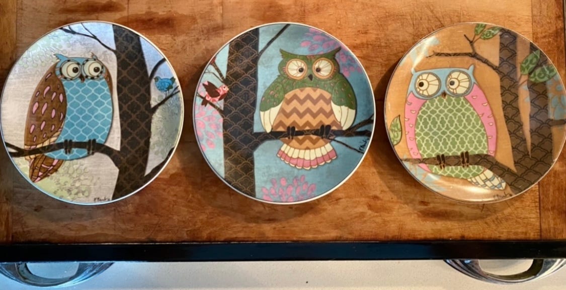 Gifts from my very thoughtful friend Cam, the plates and trivet are all from the 1970âs. They combine my love of owls and vintage finds for my new kitchen in a 1969 building.