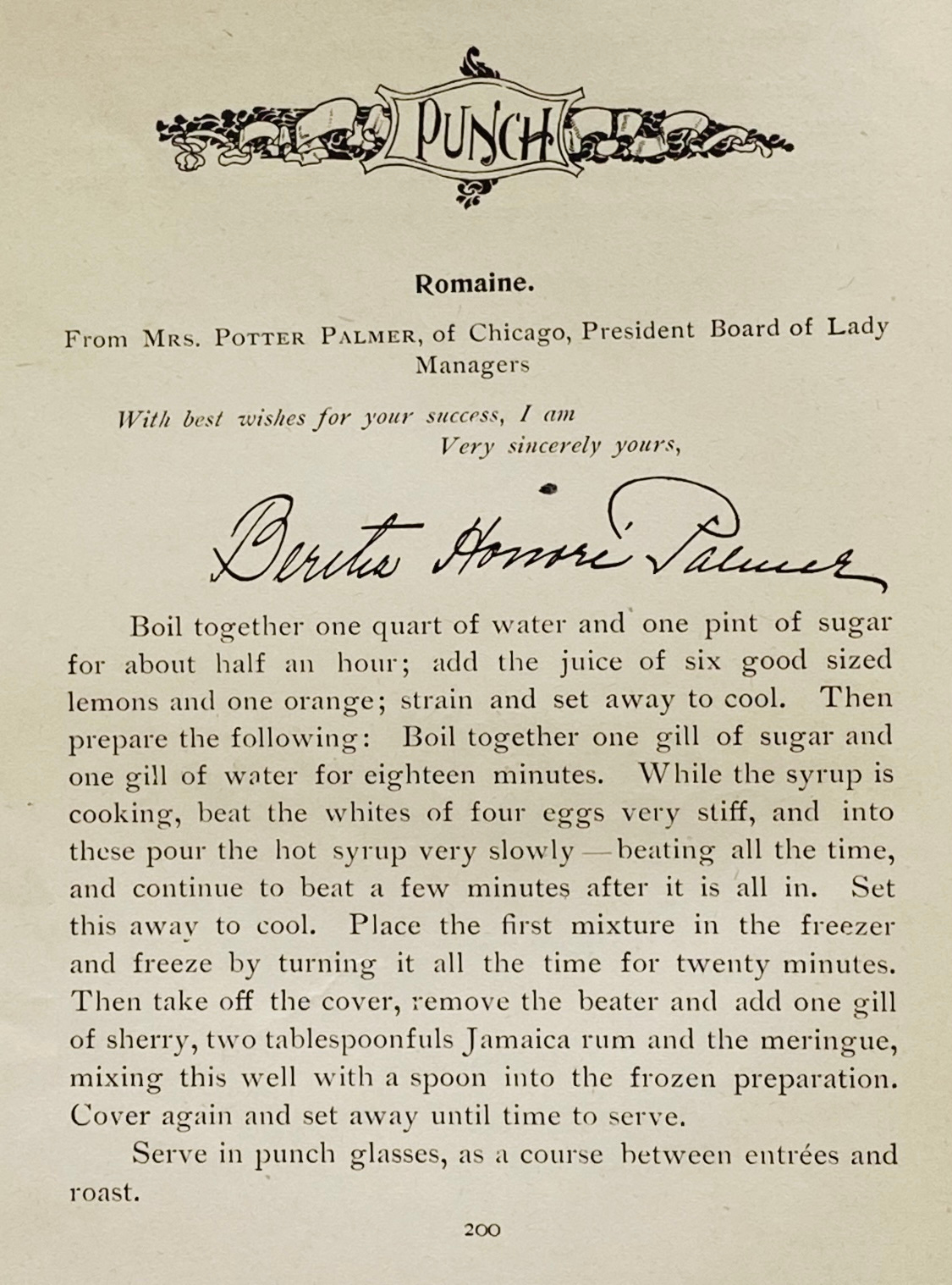 Punch Romaine was the recipe contributed by Bertha Honoré Palmer, aka Mrs. Potter Palmer, President of the Board. And as I shared recently, she is the subject of the book I’m writing. Here is the link to that post if you’d like to take a peek.