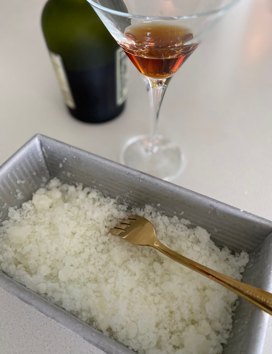 In the version below, I mounded the meringue on top and it’s easier eaten with a spoon. You get a hit of each flavor as you go, which I really like . The Granita soaks up the rum and starts melting it, but there are still icy bits, and the meringue is a sweet cloud on top.