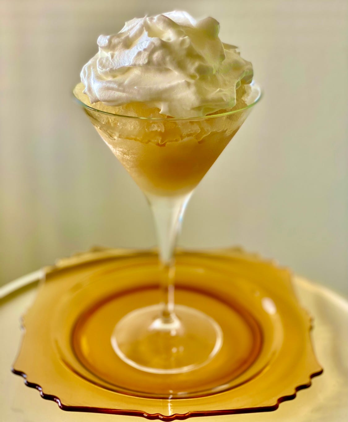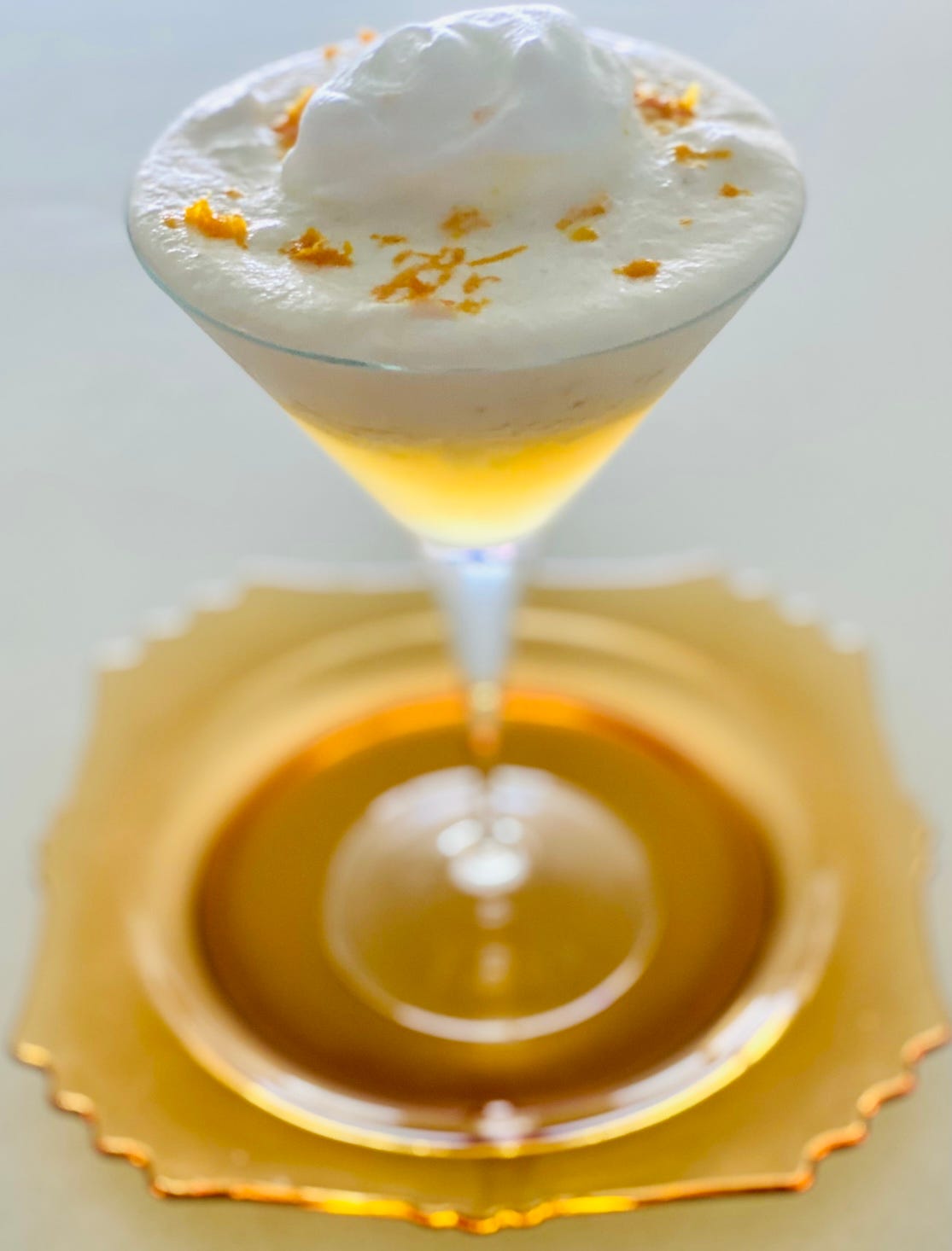I’ve made a simplified version of Bertha’s Punch from a lemon granita with orange zest (I substituted orange zest for lemon zest in the recipe attached and added 2 Tbsp. of orange juice to keep it more faithful to Bertha’s ingredients) topped with Italian meringue (I halved the recipe) and a shot of dark rum at the base of the glass. I used a Martini glass. Also: Italian meringue is great because you are adding hot sugar syrup which stabilizes it and also lessens the worry about raw egg whites.