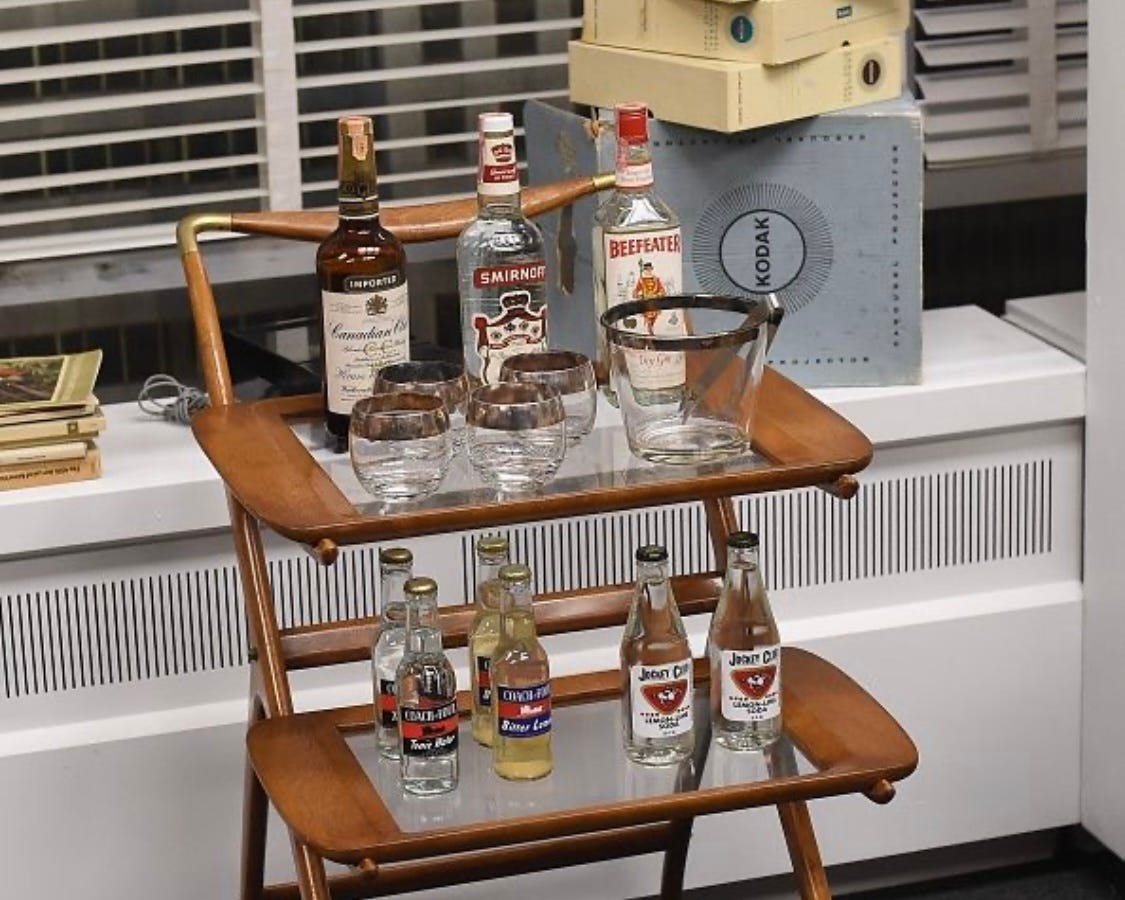 The 89th Anniversary of Prohibition Repeal Day is December 5th, so I’ll end with a picture of Don Draper’s Mid-Century Office Bar Cart, because, Why Not?
