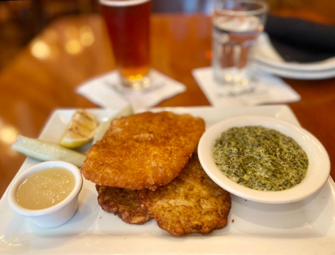 My Mom was Swedish and German and the food at The Berghoff was so familiar and delicious. I ordered some of my favorites: Wienerschnitzel, Potato Pancakes, Apple Sauce and my all-time favorite, Creamed Spinach. I had an Oktoberfest Bier made at the onsite Adams Street Brewery and loved it.