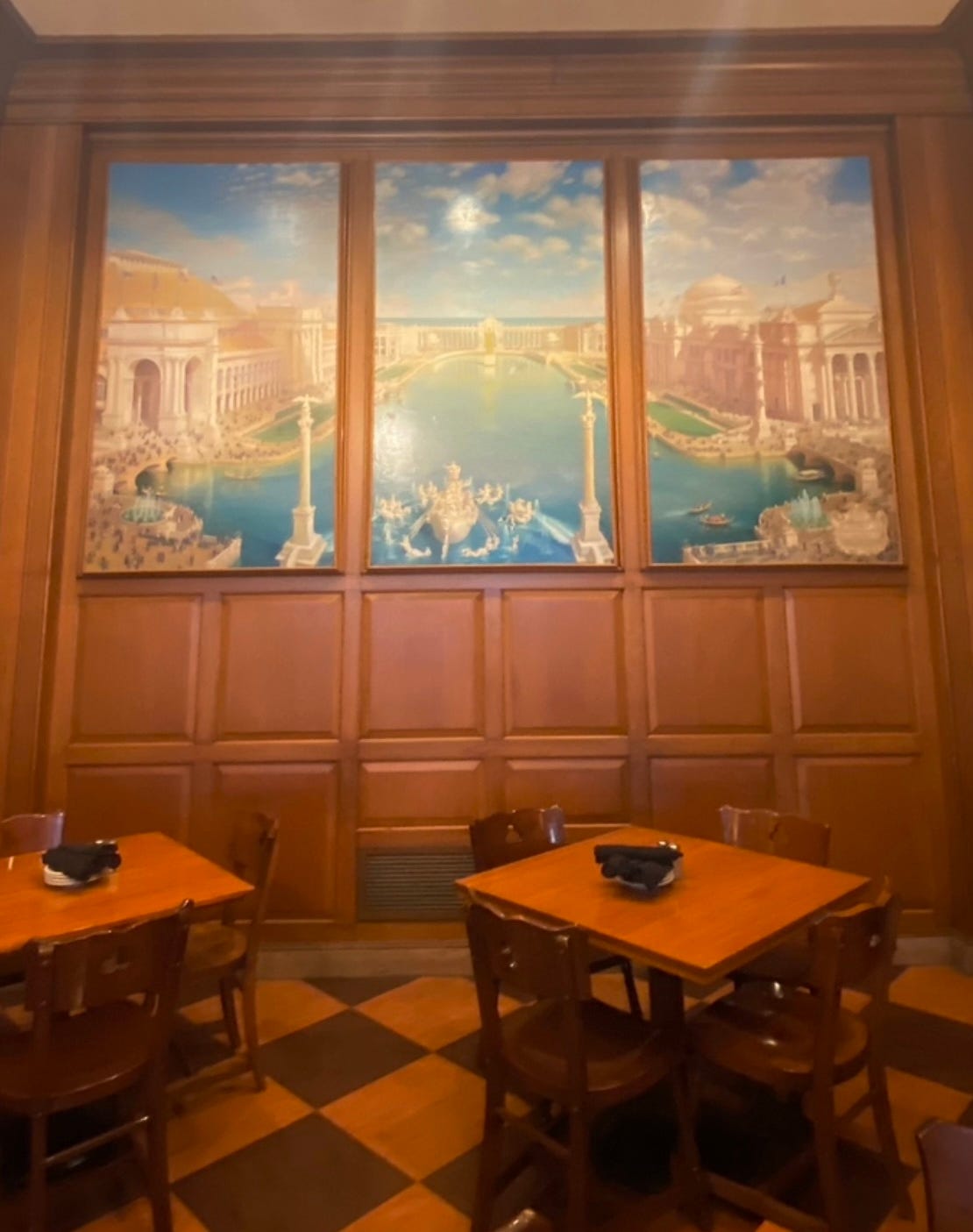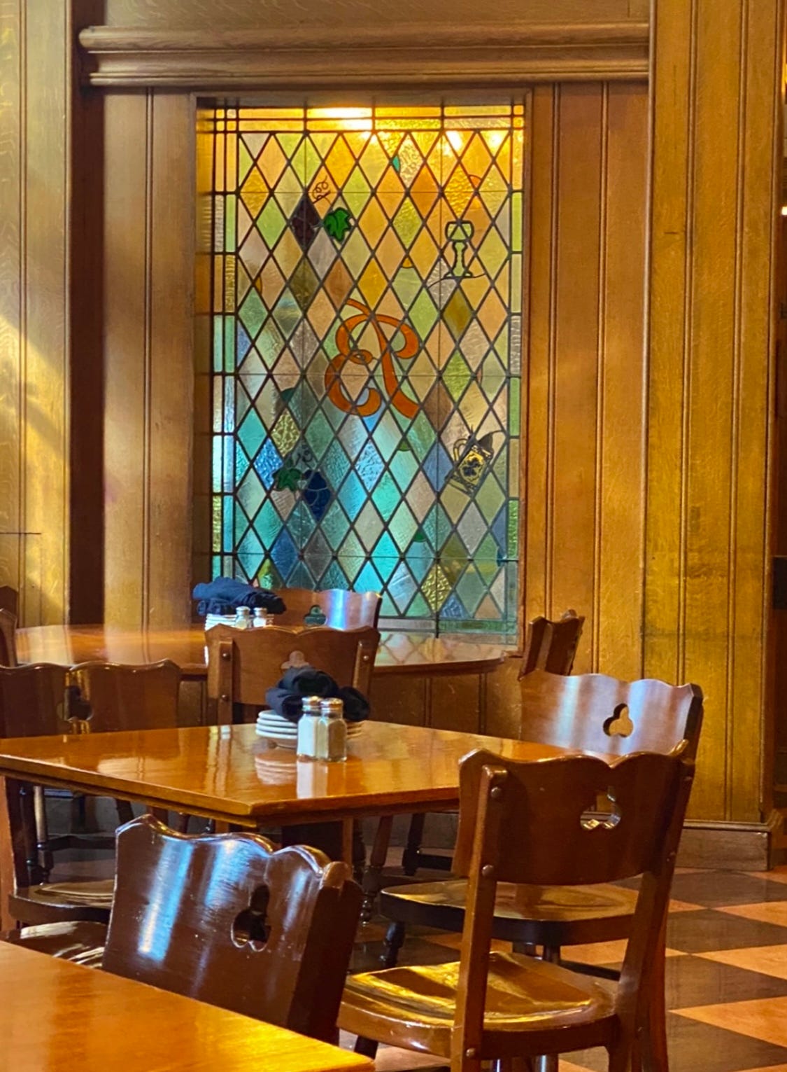 In its current location—an 1872 building Berghoff took over in 1912—there are the original murals by artist Mark Melnick. The murals sweep around the dining room and are of street scenes and the 1893 Fair that I imagine had great sentimental significance to Berghoff.
