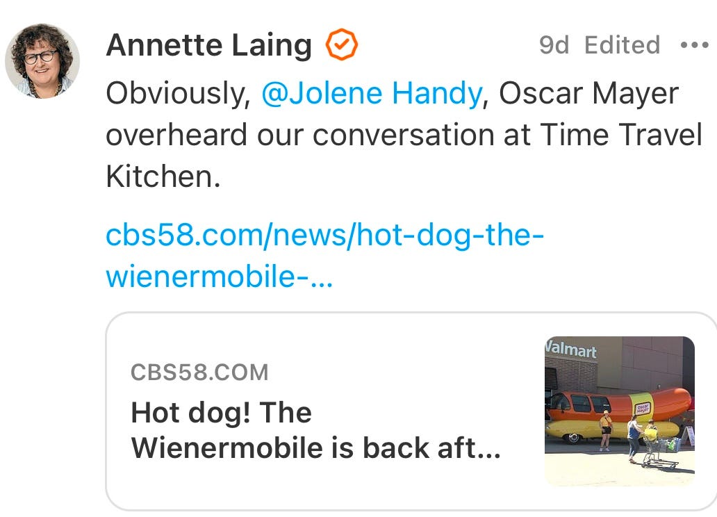 My friend, historian Annette Laing posted this Note on Substack recently alerting me to the news that the rebrand of the “Wienermobile” to the “Frankmobile” was just a summer fling. Thanks, Annette!