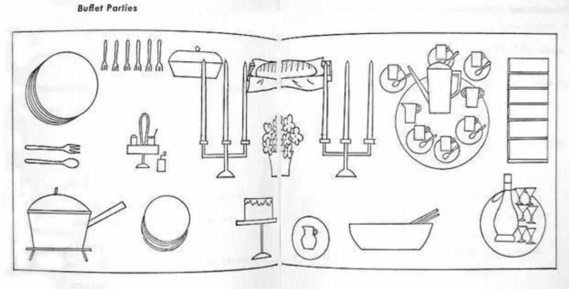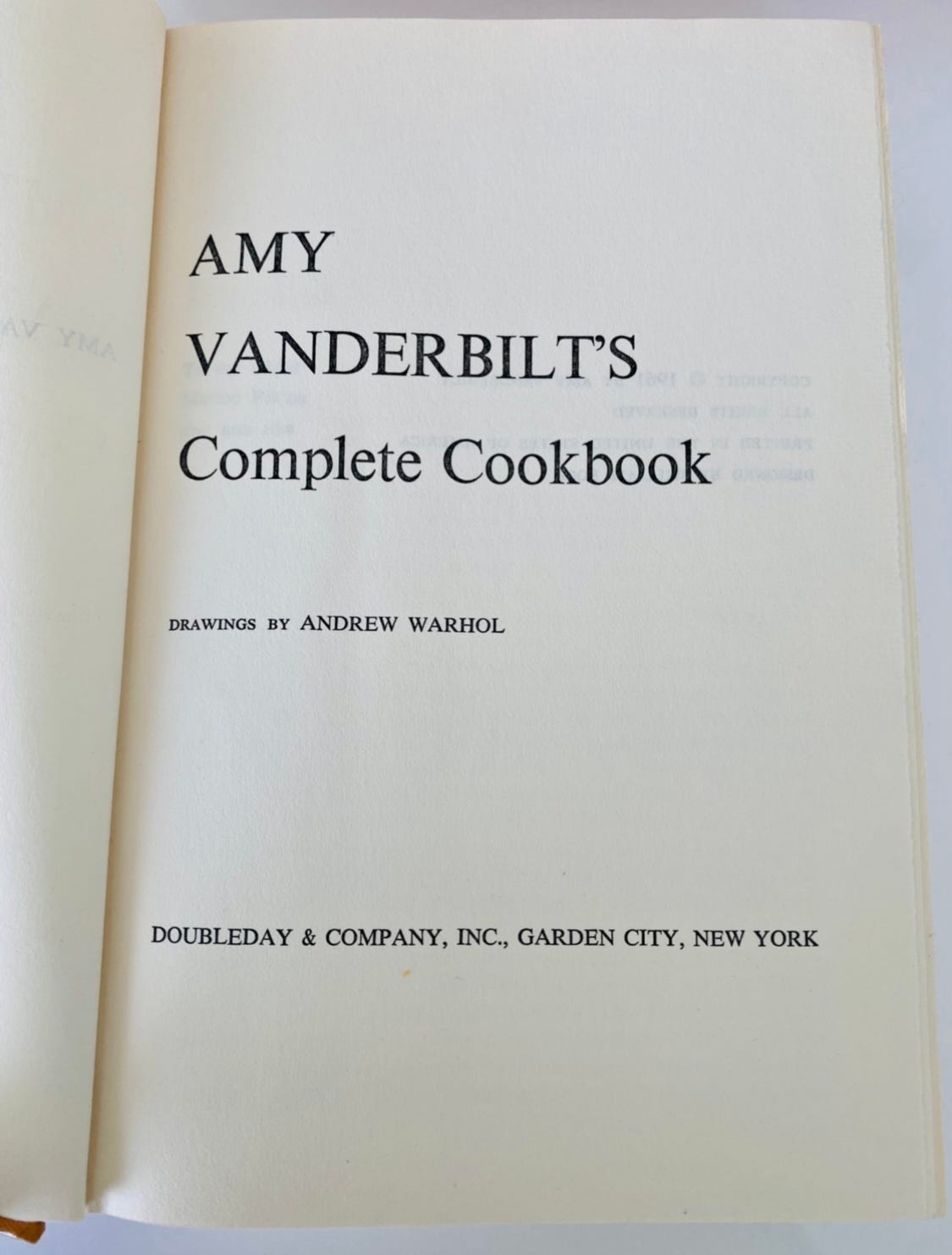 The book is etiquette expert Amy Vanderbilt’s Complete Cookbook (I found on Thriftbooks for $17, I was so curious to see the illustrations) but one of the first things you notice is the more formal ‘Andrew Warhol’ given credit for the drawings.