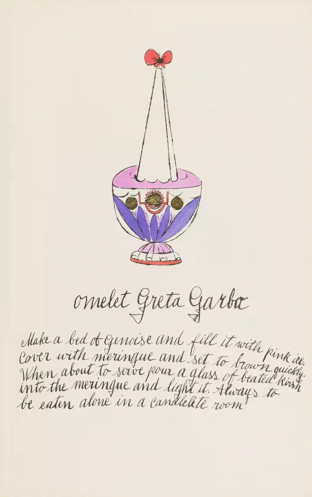 Self-published by Warhol in 1959 with his friend, designer Suzie Frankfurt, with calligraphy done by his mother, Julia Warhola, it’s a parody cookbook. Its title is a wink and a nod to Ingmar Bergman’s film “Wild Strawberries” which was released the same year.