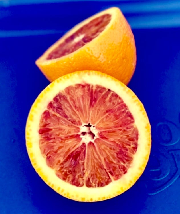 The flavor of blood oranges (to me) has a subtle floral quality, along with both a sweet and tart element. And the color is just so vivid, I love it.