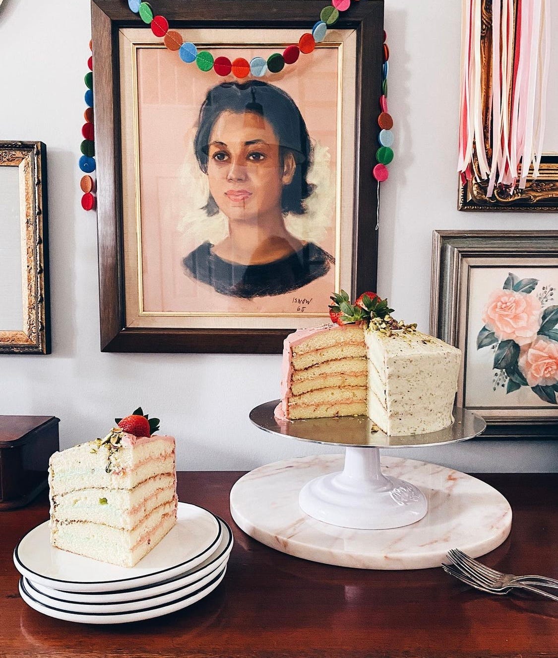 Joy: My Aunt DeDe had her portrait painted at the LA County Fair in 1965 and now is my prized possession in my home where she keeps a very close eye on all the cakes.