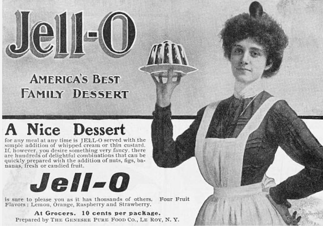 Jell-O sales were a bit lackluster in the beginning until they were boosted by ads run in the Ladies’ Home Journal proclaiming it as ‘America’s Best Family Dessert’ in the early 1900’s.
