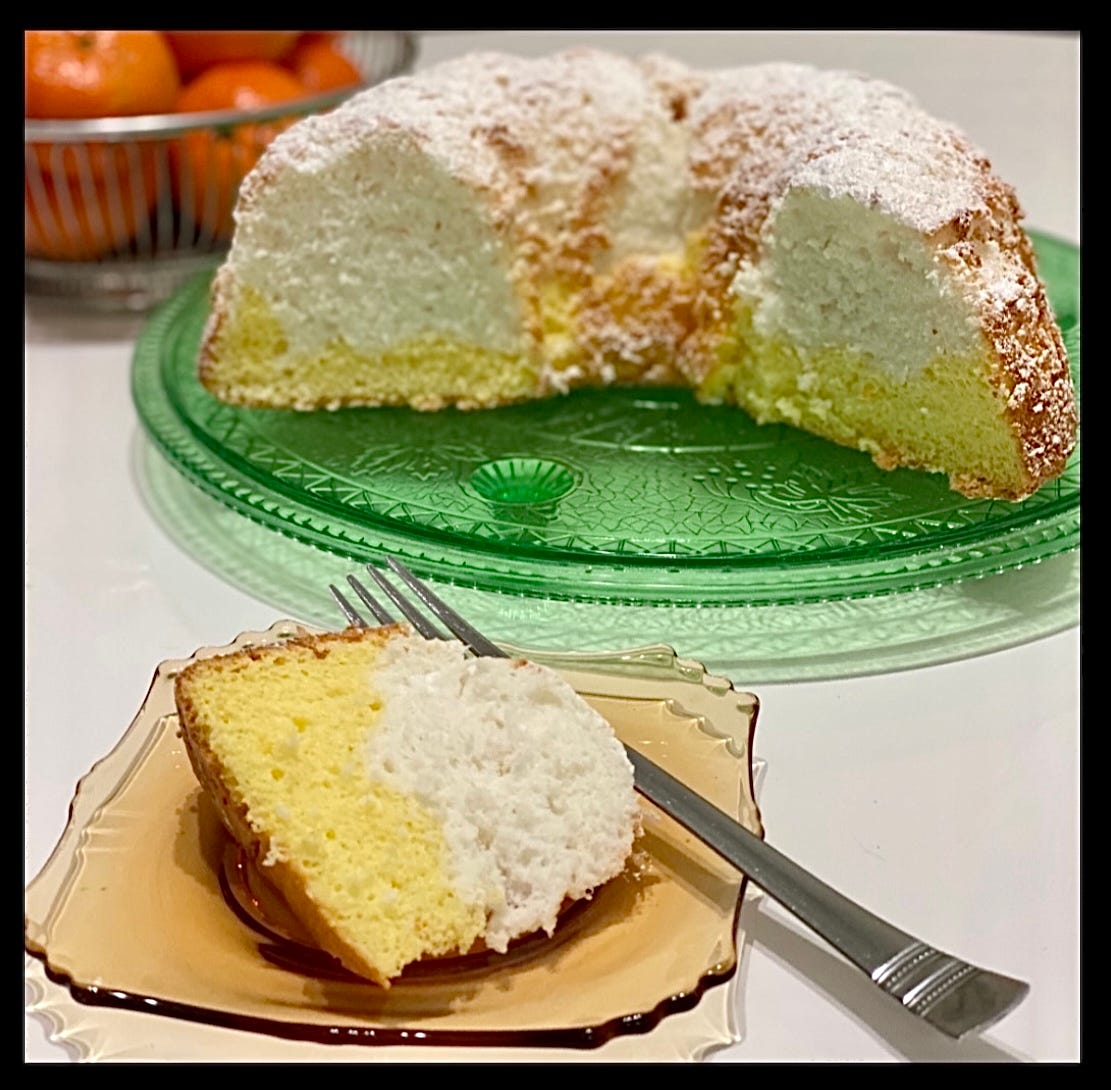 The cake may be made in a tube pan or bundt pan. It is such an airy, light cake, so pretty and so good. The Daffodil Cake I made, pictured above, sits on my Grandmother’s footed cake pedestal from her kitchen during the Depression years. The slice of cake is on a plate from a set my Mother gave me for my birthday decades ago. I’ve already had two slices.