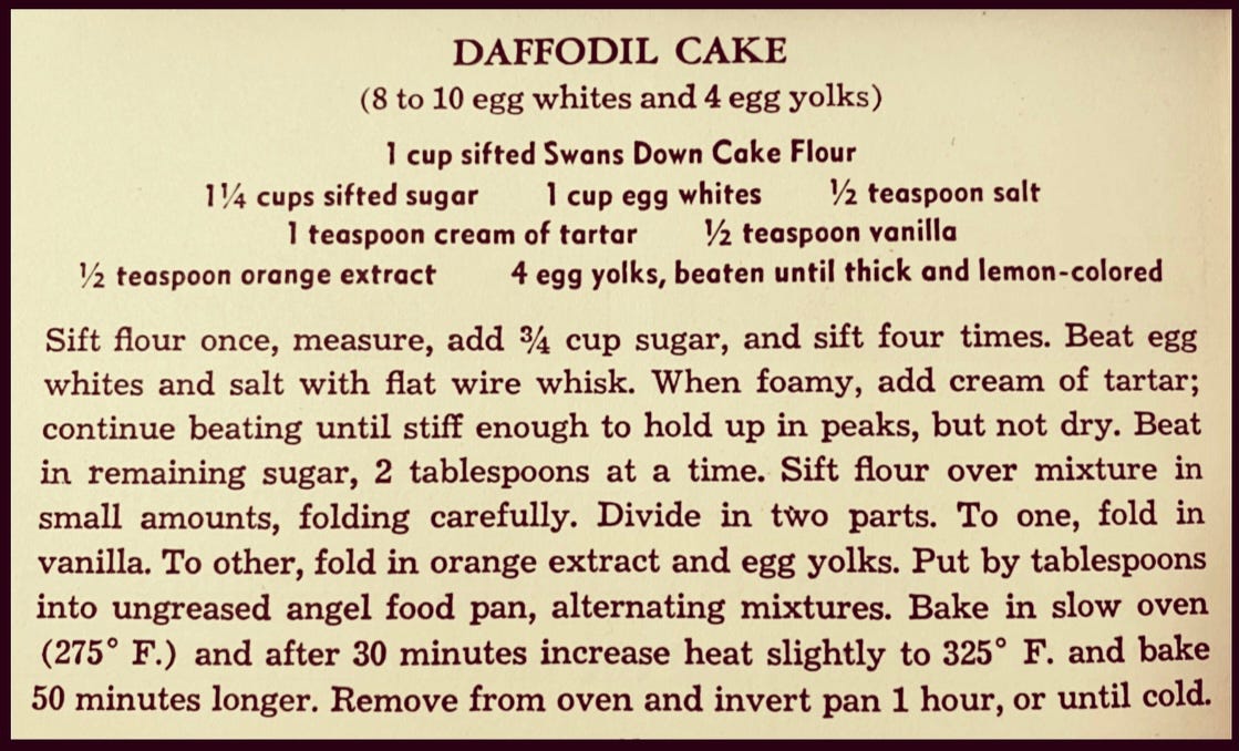 This is how I fell for Daffodil Cake. Yellow and white, fresh and cheerful—it’s springtime in a cake pan. I’d made one years ago and thought of it again since it appears in the cookbooks I’ve started collecting from the 1920’s and ‘30’s.
