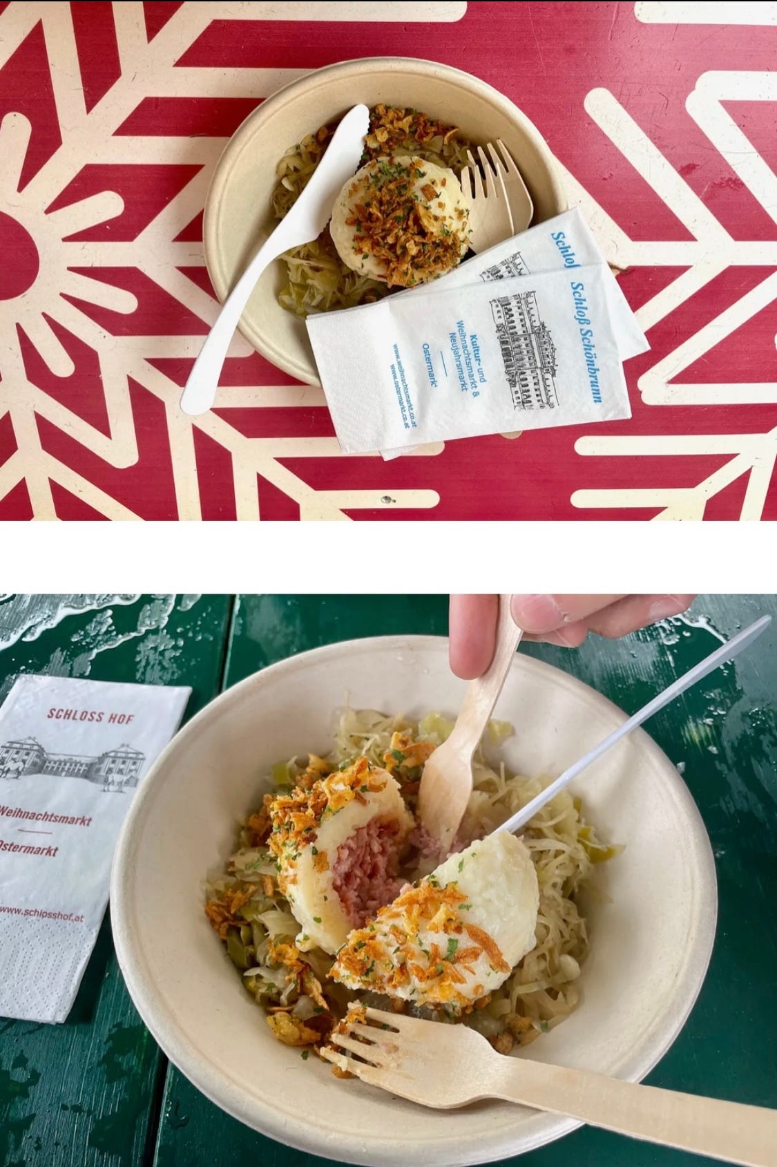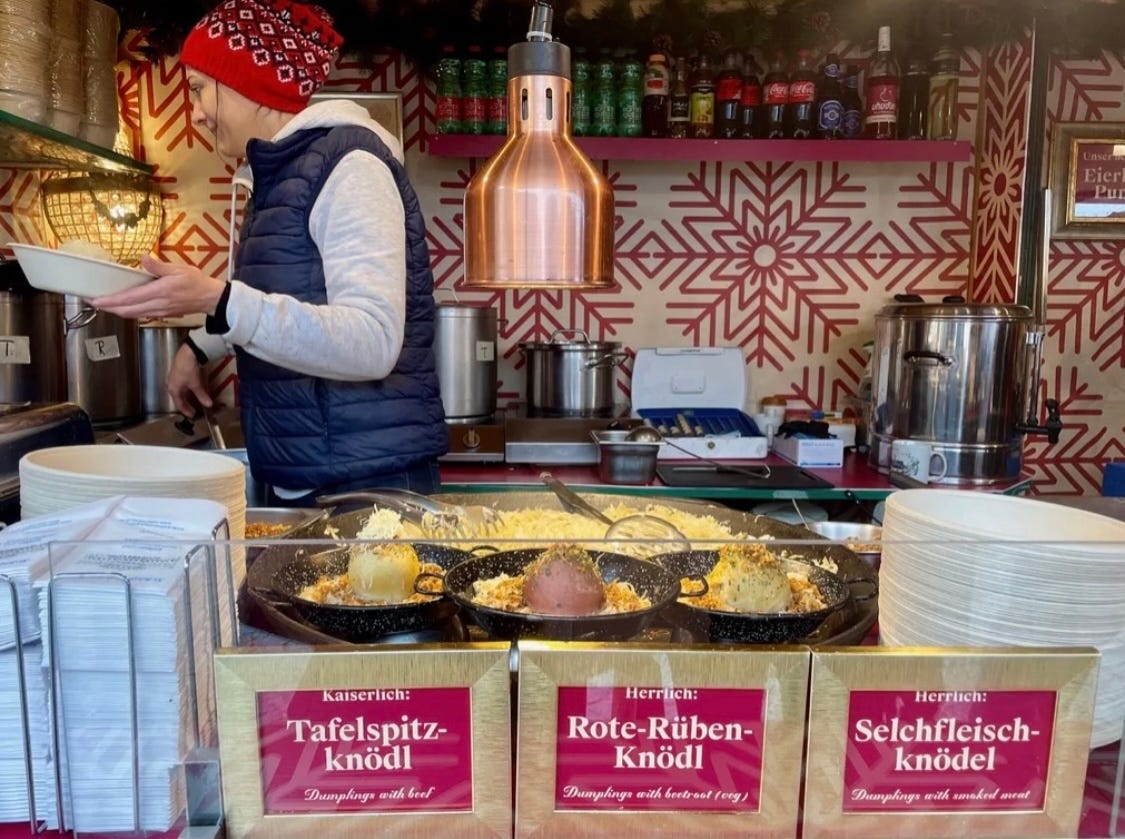 Our first stop was the market in front of Schönbrunn Palace, the summer residence of the Habsburgs (including the legendary Empress Sisi—if you haven’t yet watched The Empress on Netflix, I highly recommend it!). It was rainy and freezing when we arrived and our fingers were quickly turning to ice, so we grabbed mugs of steaming hot punsch and set out to look for a warm bite to eat. After one lap around the courtyard and peering into market stalls full of pretzels, roasted chestnuts, and fine pastries, these knödel—dumplings—looked most enticing.