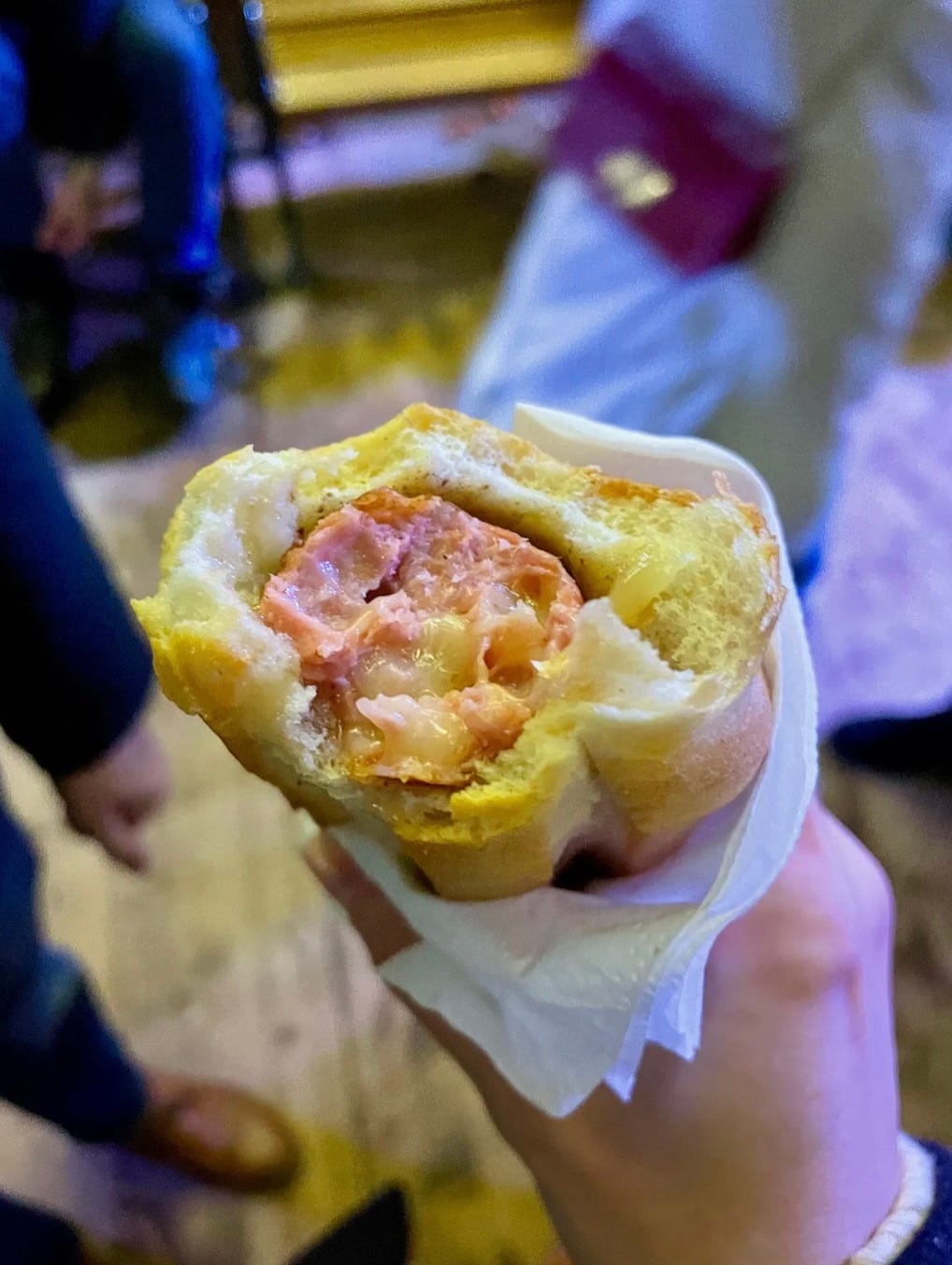 Käsekrainer—a pork sausage stuffed with cheese, usually Emmental, and served in a toasted hot dog bun for portability—is now on that list. Käsekrainer’s cheesy, meaty, juicy goodness would be right at home at an American state fair, and it might be the best thing I ate all weekend. I searched for this little beauty for days before finally tracking it down at a stall in the enormous market in front of Vienna’s historic city hall. My husband and I had to fight our way through a throng of people pleasantly buzzed on Christmas punsch to get it, but it was worth it. I honestly wish we hadn’t split one in an attempt to save room to try other snacks, because having to share something so delicious was just sad.